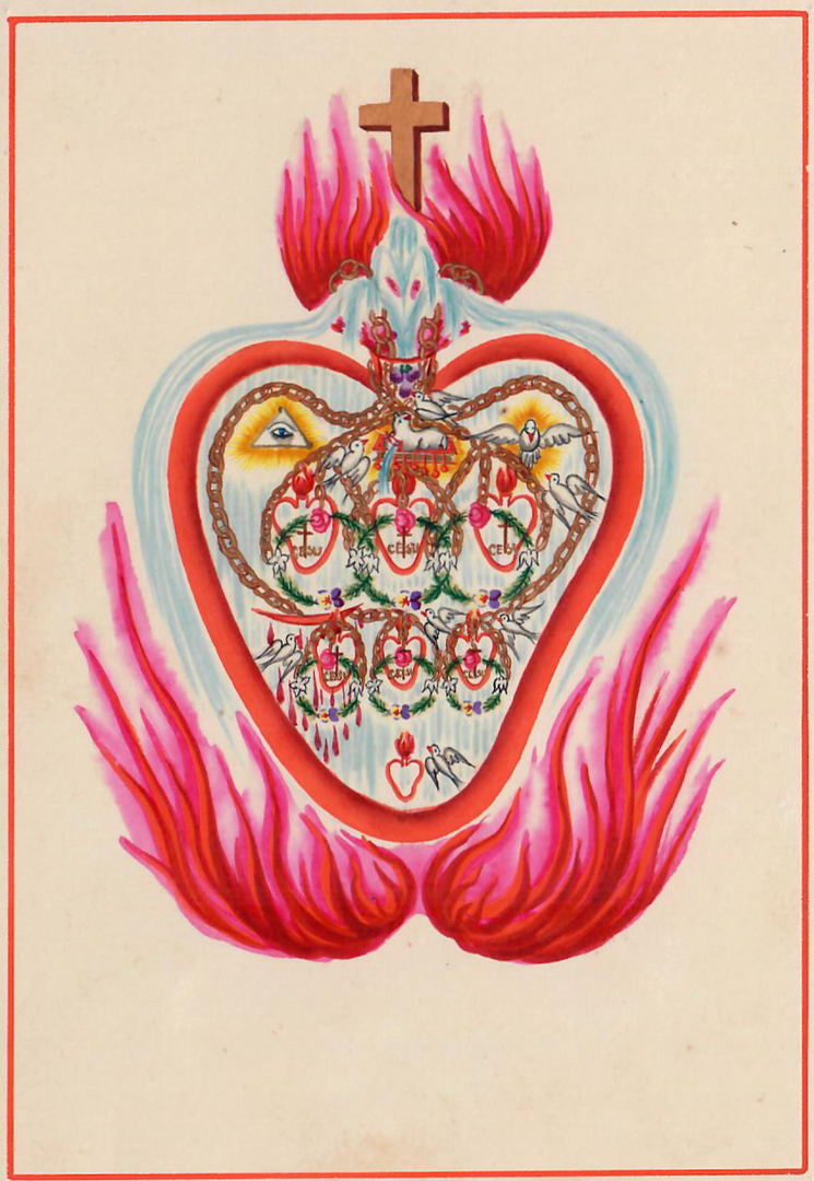 L’interno del cuore di Gesù è pieno sempre della Grazia, come rappresentato dall’acqua. Nella parte alta del Cuore vi è rappresentata la Santissima Trinità, questa volta non nel simbolo delle tre rose uguali (l’unica sostanza), ma con tre simboli diversi (le tre Persone). Il primo a sinistra è un occhio inscritto in un triangolo: è il Padre, origine di ogni cosa, onnipresente, onniscente, onnipotente. Al centro il Figlio, generato non creato dal Padre, agnello immolato, come descritto nel libro dell’Apocalisse, sotto il quale è posto il libro con i sette sigilli, che soltanto Lui può aprire (cfr. Ap 5ss). A destra lo Spirito Santo, che procede dal Padre e dal Figlio, nella forma di colomba così come era disceso su Gesù nel Giordano, il giorno del battesimo (cfr. Mc 1,10). Tutti e Tre emanano luce, calore, amore, che si materializza nelle catene d’oro con cui legano a sé i cuori sottostanti: le conosciamo, sono le catene dell’amore, che esprimono la relazione tra Dio e ciascuna anima.