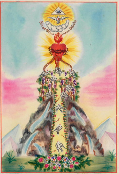 Anche questa volta siamo di fronte a un monte: è il Tabor. E’ riconoscibile perché in alto vi è rappresentata la Santissima Trinità, questa volta non con il simbolo delle tre rose, ma con l’iconografia classica: l’occhio del Padre, la colomba dello Spirito, il Cuore di Gesù, il triangolo trinitario. Vi è poi la scritta in latino “Questi è il mio Figlio prediletto”, che rimanda all’episodio evangelico della trasfigurazione. Infine la nube. Alla ferita del Cuore di Gesù sono legate con tre catene d’oro, le catene dell’amore, tre colombe: sono gli apostoli Pietro, Giacomo e Giovanni, quelli che Gesù prese appunto con sé sul Tabor (cfr Mc 9,2-8). Ci è poi una colomba libera, che Madre Serafina dice essere lei stessa, che durante una sua estasi ha ricevuto la grazia di poter contemplare questo evento narrato da tutti e tre i vangeli sinottici. L’esperienza taborica è molto cara alla spiritualità dell’oriente cristiano, sia tra i cristiani greci sia tra quelli slavi. E’ infatti la meta dell’intero cammino spirituale e consiste nella contemplazione della luce taborica all’interno del proprio cuore, purificato e dunque deificato. E’ la partecipazione alla comunione trinitaria, che è dono elargito, ma dopo un lungo cammino di ascesi e purificazione. Non è frutto del proprio merito, ma dono di grazia che però necessita di uno spazio di accoglienza: a questo serve l’ascesi, a liberare il cuore da ciò che non serve, da ciò che ostacola, da ciò che non appartiene alla verità dell’uomo creato a immagine e somiglianza di Dio. La contemplazione della luce taborica è l’esperienza che suggella l’autenticità del cammino spirituale. Solo dopo che il padre spirituale o la madre spirituale ha riconosciuto nel discepolo questa esperienza, allora quest’ultimo può iniziare a scrivere, con le parole o con i colori (le icone), per dire la Trinità; se così non è, si dice solo la propria miseria.